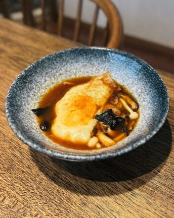 宋居是茶馆,也为茶客们的口腹之慾设计了一系列主食和甜食菜单,且都是纯素料理。Vicky 为我们推荐三道主食,包括黄酒鸡蛋养生汤饭、红茶养生火锅以及随机茶泡饭。以“金汤”命名的黄酒鸡蛋养生汤饭是首道呈上的料理,金黄醇厚的汤汁色香味俱全,还有一颗煎至金黄的荷包蛋。其汤汁香气浓郁,偏甜,很下饭。这道料理搭配的主食是一碗看似糙米饭的白饭,但实际上这是由红茶浸泡而煮成的白饭。以红茶上色的白饭不仅看起来更具食欲,还有一股红茶的清香。