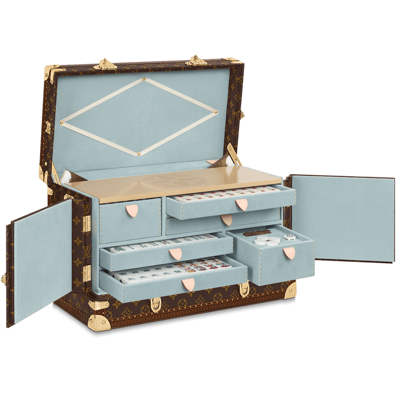 路易威登(Louis Vuitton)与香港建筑及室内设计工作室Studio Adjective合作设计了一副麻将,浅蓝色一格格的抽屉收纳了144只牌及5只后备牌、4把麻将木尺、4枚木制骰子、1枚风向骰子及骰盘,样样俱全。工作室以建筑概念赋予麻将牌十足气质,用上了胡桃木、黄铜和复合石材,并且重新设计牌组图案;Monogram图案贯穿设计,很有现代感。售价:520,000港元(278,718令吉左右)