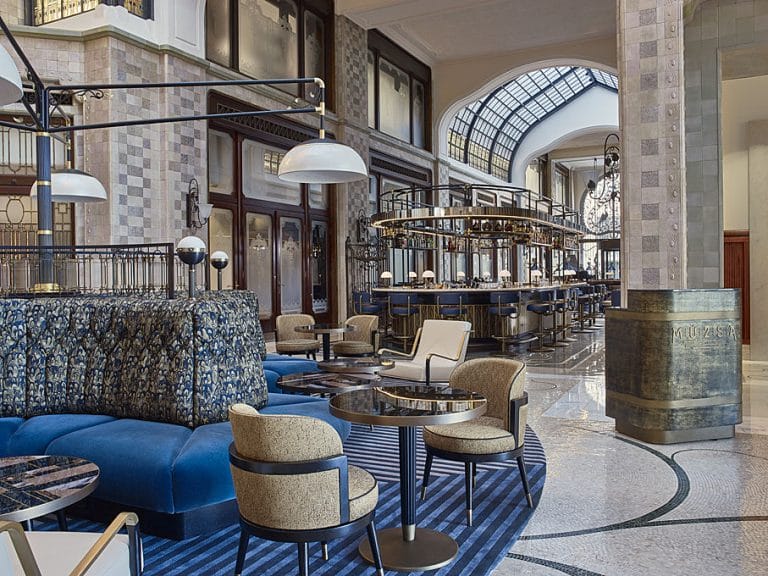 位于布达佩斯的四季格雷沙宫(Four Seasons Gresham Palace),Múzsa的酒吧名称源自匈牙利语中“缪斯”,设计融合了建筑本身的丰富历史和现代风格,漫溢华丽古典气息,象征了曾经在布达佩斯蓬勃发展的新艺术运动时代。
