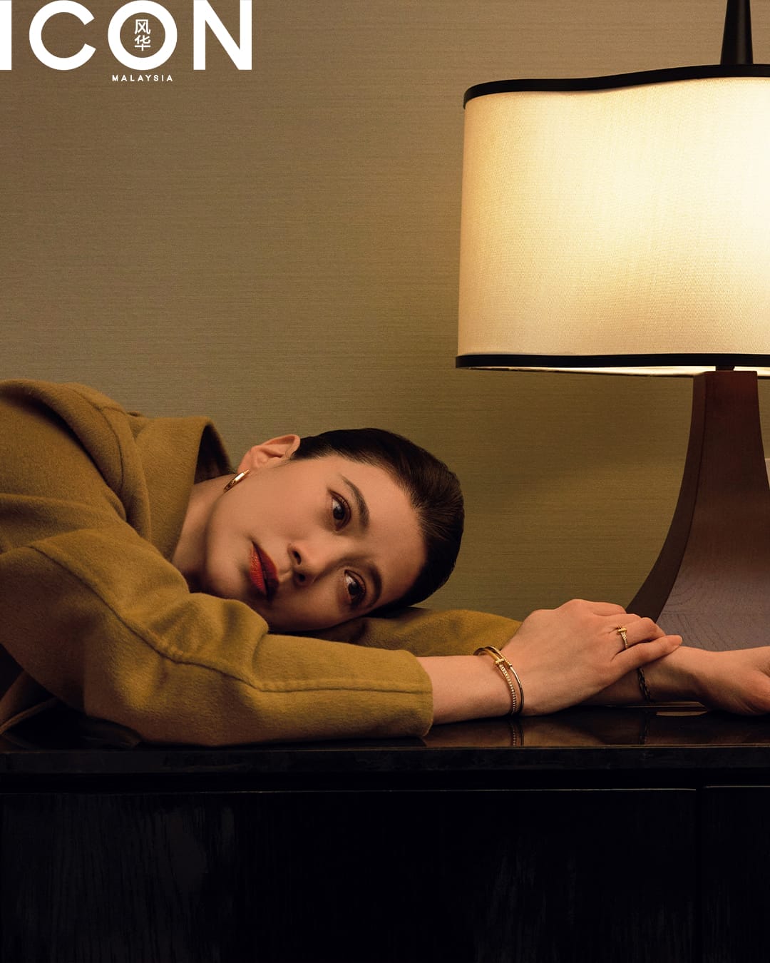 驼色外套/ Prada;Tiffany Lock耳环、Tiffany T T1戒指和手镯/ Tiffany & Co.。
