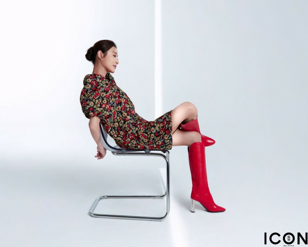 印花连身裙/ Ganni @Club21 Multilabel; 红色皮革及膝靴/ Longchamp