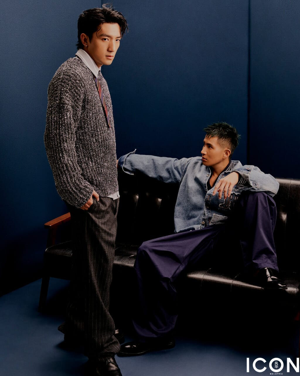 原腾: 银色套头衫、条纹衬衫、条纹领带、条纹西装裤/ MSGM;沈展宁: 丹宁夹克、棒球外套、宽管裤/ MSGM