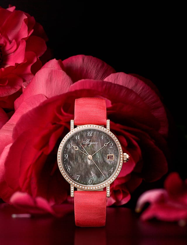 娇俏红颜 从18世纪开始,Breguet凭着简约风格以及卓越可靠的时计臻品,吸引了欧洲众多尊贵女性的青睐。如今,品牌全新推出专为女性设计的Classique经典系列9065腕表,引入一抹耀眼的朱砂红色,美钻缀饰大溪地珍珠母贝表盘,犹如娇俏红颜,唤醒了雅致的浪漫主义风格。金质色调的秒针,以深红色心形装饰,似乎随着时光流逝而跳动。腕表镶嵌明亮式切割钻石,衬以红色缎面表带,散发闪耀的活力,全球限量推出28枚。