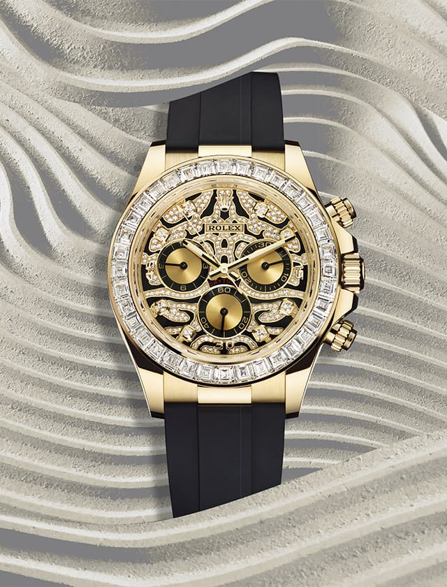 本届巴塞尔国际钟表珠宝展上,Rolex隆重推出了一系列新款腕表。专为热衷驾驶与追求速度的人士而设的Oyster Perpetual Cosmograph Daytona腕表换上独特崭新面貌,在外圈上以36颗梯形钻石代替经典的测速计。在密镶钻石的黑色漆面表盘上,香槟色计时盘、黑漆与钻石相互交织。表盘上的八颗钻石钟点标记,以18ct黄金底座镶托着,优雅典美。