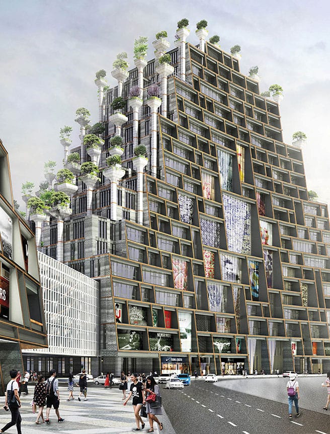 英国著名鬼才建筑大师Thomas Heatherwick再次以奇思妙想震撼世人,由他操刀、一幢名为“1000棵树”(1000 Trees)的城市森林山丘建筑,犹如重现世界七大奇迹巴比伦空中花园般,挟着万千恢宏气势亮相魔都上海,掀起全城热仪。这个占地六公顷的“1000棵树”项目座落于上海M50创意园区旁的天安广场上,共由400个露台互相重叠,并在梁柱上种植多达千棵树木,具有浓厚自然意象,以高低起伏的编排设计融入周边新旧城市景象,让建筑物不只是一幢矗立的高楼而已。建筑团队表示,因而中国房地产开发趋势增长迅速,若是再建立一座大楼,反而与邻近的商城相同,因此有了此次独特的建造理念。这幢拥有购物、休闲、娱乐等多项功能的建筑,预计在2019年正式完工。