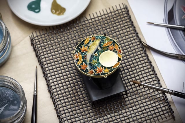 其中,这款“鱼跃四季”三问报时陀飞轮腕表巧妙运用手工雕刻和珐琅工艺,融入自然主义艺术色彩,彰显了品牌深厚的制表工艺。