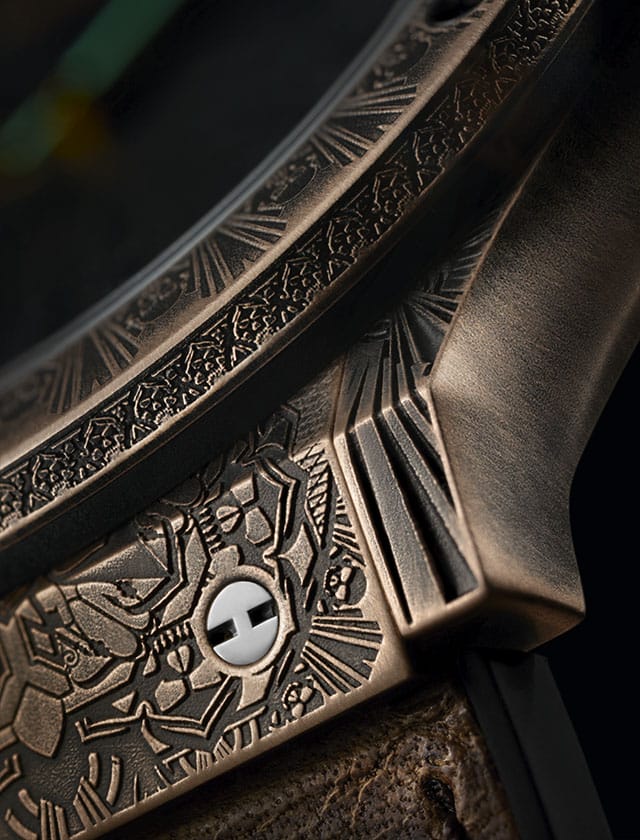 放肆不羁与创新的灵魂穿梭在腕表古老的钛金属与青铜色间,谱写着制表与音乐之间的奇妙恋情。表壳主体运用黑色的青铜和老化的钛切割而成,表圈上充满风格化的头骨、摇滚音乐的经典标志与装饰的艺术图完美交替。