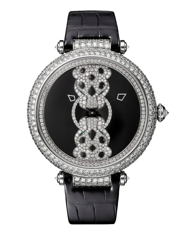 骤眼一看,Cartier Rencontre de Panthères腕表珍珠母贝表盘中央衔着一枚钻环的2只美洲豹只是一项装饰,但当佩戴者手腕摆动时,此美洲豹装饰就会随着各种动作而左右摆动甚至旋转产生力矩,并依靠自动上链机芯将这力矩转为发条盒上链。品牌把传统内部的机芯搬到表盘上,让美洲豹突破静态,更显活泼动感。