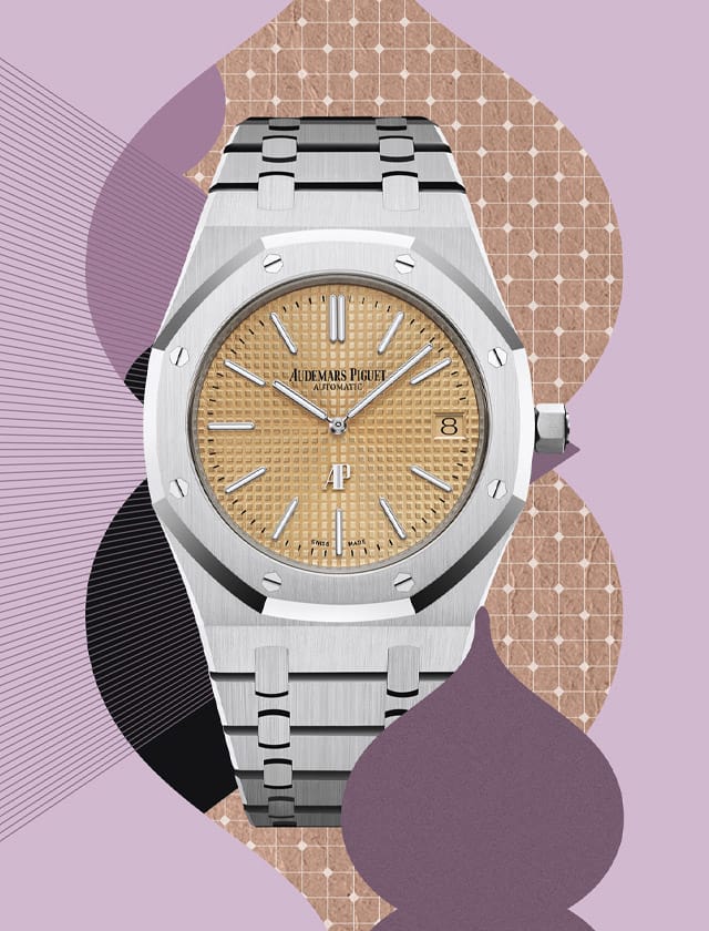 Audemars Piguet皇家橡树系列“JUMBO”超薄腕表,玫瑰金色表盘镌刻“Petite Tapisserie”小格纹装饰,于1992年皇家橡树系列面世20周年之际推出,搭配白金荧光立体时标和皇家橡树指针,有史以来首次搭配18K白金表壳和表带。