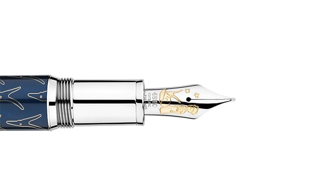 的笔身与笔盖,采用墨蓝色的高级树脂制成。此深邃神秘的墨蓝色,灵感来自《小王子》一书中所描述的浩瀚宇宙的深蓝色天空。笔盖镌刻上狐狸图案,此角色在书中启发了小王子对人际关系的省思。笔夹缀以金黄色星星,喻意来自星星的笑声,以及14K金镀铑笔尖镌有小王子与狐狸的图案。另外,在此系列所有书写工具的顶端均以镭射雕刻摘录自《小王子》书中的一句话:”