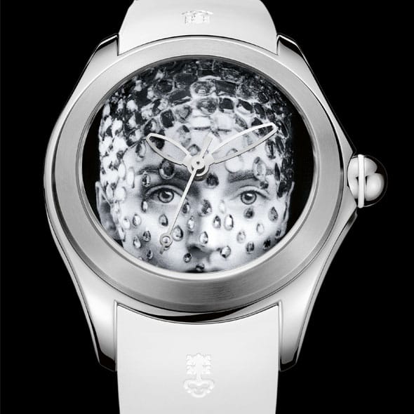 Corum Bubble泡泡腕表以其超大表盘搭配状似泡泡的拱形表镜被视为业界时计设计典范。全新Bubble 42 Juliette Jourdain限量版泡泡腕表与年轻摄影师Juliette Jourdain合作,打造浓郁文艺气息的自画像Bubble泡泡腕表。肖像纯净澄澈,目光炯炯有神,轮廓清晰分明,惊艳展现其精致优雅却又非凡不羁的个性。晶莹璀璨的钻石滴沿面庞倾泻而下,再配以经典隽永的传统蓝宝石拱形镜面,透过纯净色彩散发摄人心魄的魅力。该腕表不设数字及参照,配其含蓄内敛的指针,素雅迷人。莹白色硫化橡胶带与金属灰不锈钢冷调搭配,活力个性且酷冷十足。