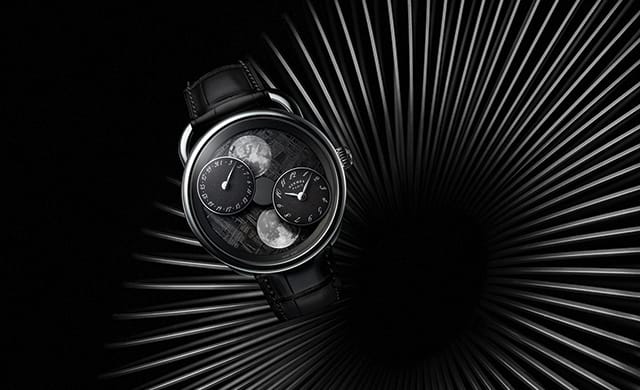 Hermès全新Arceau系列L’heure de la lune月读时光腕表,以独特的视角来解读月球,同时显示北半球与南半球的月相盈亏。两个围绕盘面运转移动的副表盘,随着机芯中独创机制的节奏,显露出珍珠母贝精制的月相盘。腕表采用白金表壳(68.2克),直径43毫米,共有陨石和砂金石两款表盘,搭载品牌自制H1837自动上链机芯,全球各限量发售100枚。