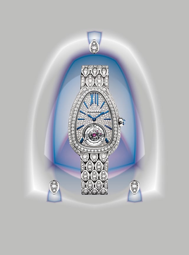 2020迪拜LVMH钟表周上,Bvlgari呈献全新Serpenti Seduttori鎏光蛇影陀飞轮腕表。这枚微型机械机芯意在契合Serpenti系列腕表别具一格的蛇头表壳。在高级制表工艺的加持下,这枚镀铑机芯采用手工装饰日内瓦波纹、珍珠圆点打磨纹润饰与倒角修饰,搭配蓝宝石玻璃表桥。不同于其他钟表制造商,品牌推崇工艺技术遵循美学设计这一理念。因此,其甄选透明蓝宝石玻璃表背,与陀飞轮装置高度齐平,凸显整枚腕表的精妙机芯与装饰工艺。位于2点与3点位置间的上链柄轴倾斜6度并饰以独特密镶工艺,从而使表壳设计尽可能纤薄精巧。
