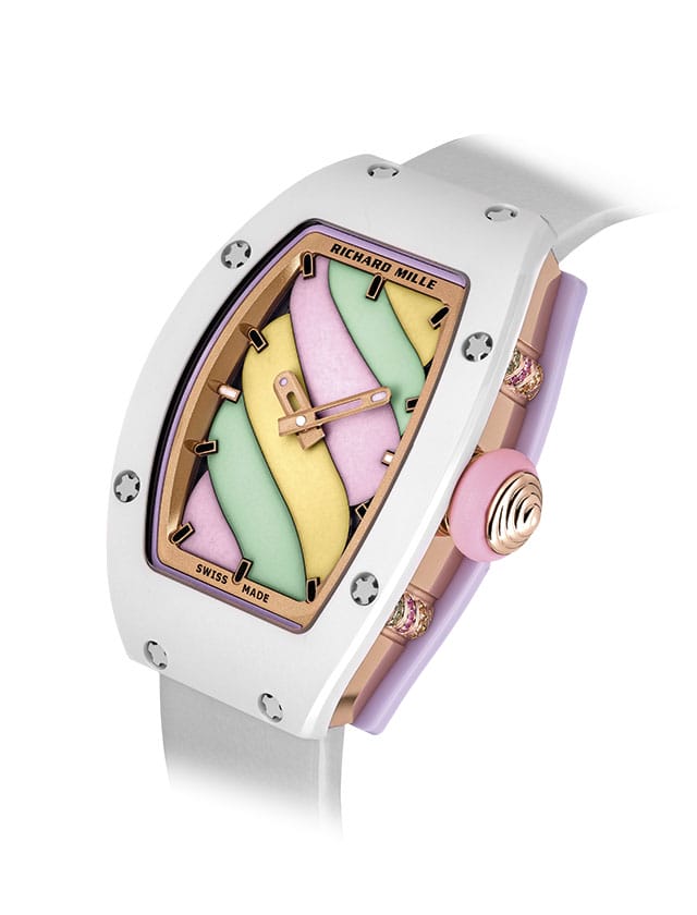 Sweets系列共有四个表款,分别为RM 07-03 Cupcake、RM 07-03 Marshmallow、RM 37-01 Sucette和RM 16-01 Reglisse款式,所有表款均采用双色陶瓷表壳造型,以大明火珐琅饰面或黑色钛金与铬金巧妙演绎美味糖果。而Fruits系列腕表则有六种口味,向甜点乐趣致敬。