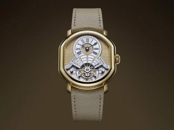 腕表采用标志性的双椭圆形设计,由 18K 黄金打造,表壳直径 38.6 毫米,厚度为 9.2 毫米,而表盘设计则延续最初版本,散发出极致的复古韵味。其分钟显示与陀飞轮完美融合,三根分针长短不一,搭载 DR001 手动上链机芯,提供 80 小时动力储存,限量发行 20 枚。