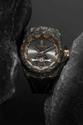 Corum以10枚限量版腕表祝贺Cortina Watch创立50周年。品牌在选用材料上再有新突破,这款Admiral 45 Tourbillon周年纪念腕表大胆采用混合碳和18K金的融合材料打造,直径45毫米十二边形表壳,由波动的碳复合材料层与18K金内含物结成的随机效果,让每款腕表的外观尽显独一无二。