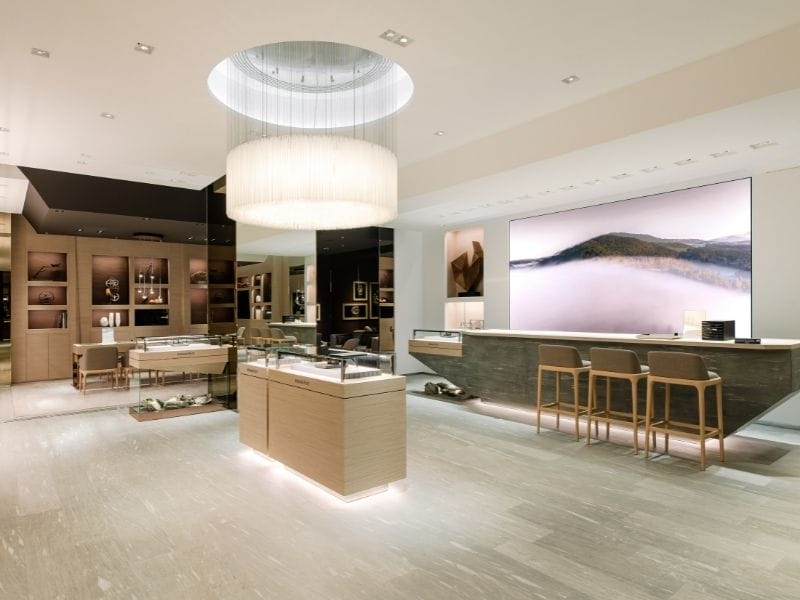 爱彼(Audemars Piguet)位于The Starhill的精品店如今重新开业,全新精品店经过翻新后比原本的面积大两倍,占地2,842平方尺。室内设计灵感来自于制表厂起源地瑞士侏罗山脉及作为工艺核心的传统与前瞻性思维的融合。这家精品店主要以结合木质和石头的定制家具为特色,整体简洁而明亮,突显了自然格调,室内的金属装饰加上温和的灯光,尽显低调奢华且舒适愜意的购物空间。