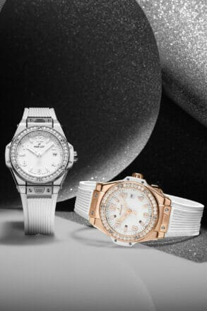 Hublot 宇舶表(Hublot)Big Bang One Click King Gold White Diamonds腕表的表壳直径33毫米,采用抛光及缎面18K王金打造,搭配哑光白色表盘,表圈镶嵌36颗闪耀的钻石,仿佛将流光溢彩凝于腕间,光彩耀眼。表款搭载机芯HUB1120自动上链机芯,动力储存40小时,防水深度达100米,再与白色橡胶表带搭配,并饰有18K王金和精钢折叠表扣。