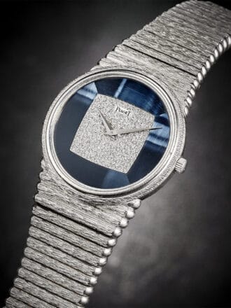 厚实白金自动链带腕表,搭配镶钻与鹰眼石面盘,展现伯爵在宝石镶嵌与表盘工艺上的深厚实力,是 1970 年代华丽风格的优雅典范。
