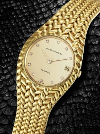 罕有黄金自动上弦腕表,设镶钻时标与日期功能,搭配带有 “GRG” 印记的精致编织黄金链带,由 Roland-Gilbert Gaschen 工坊制作,是 1980 年代爱彼前卫奢华理念的经典体现。