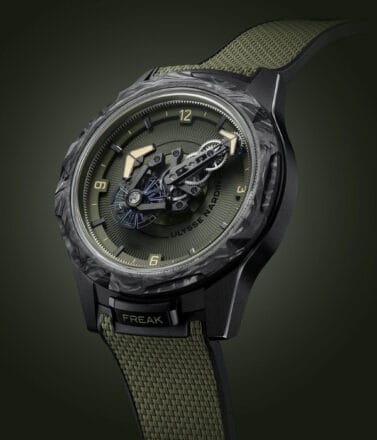 雅典表(Ulysse Nardin)为 Freak ONE 腕表系列赋予焕新诠释,推出全新 Freak ONE OPS 腕表,将卡其绿色与黑色完美碰撞。腕表表壳直径 44 毫米,以黑色 DLC 镀层钛金属打造,表圈以 Carbonium® 碳正离子材料打造,这种材料皆为飞机部件的边角料制成,生产过程中所产生的环境影响相比其他碳复合材料低于 40%,经由有机工艺打造而成,其大理石般的流动纹理,赋予每一枚腕表的表圈独一无二的美感。