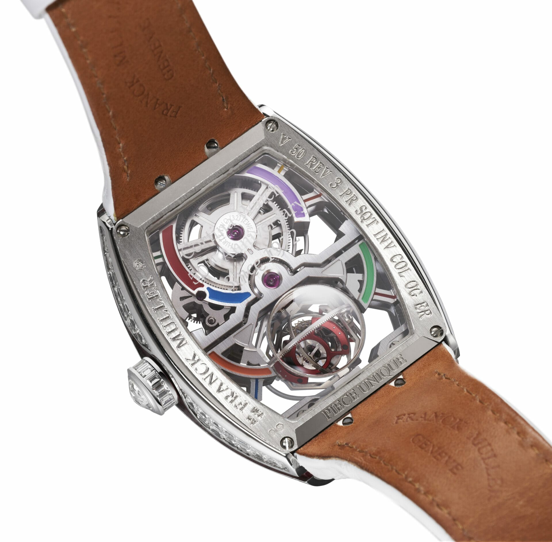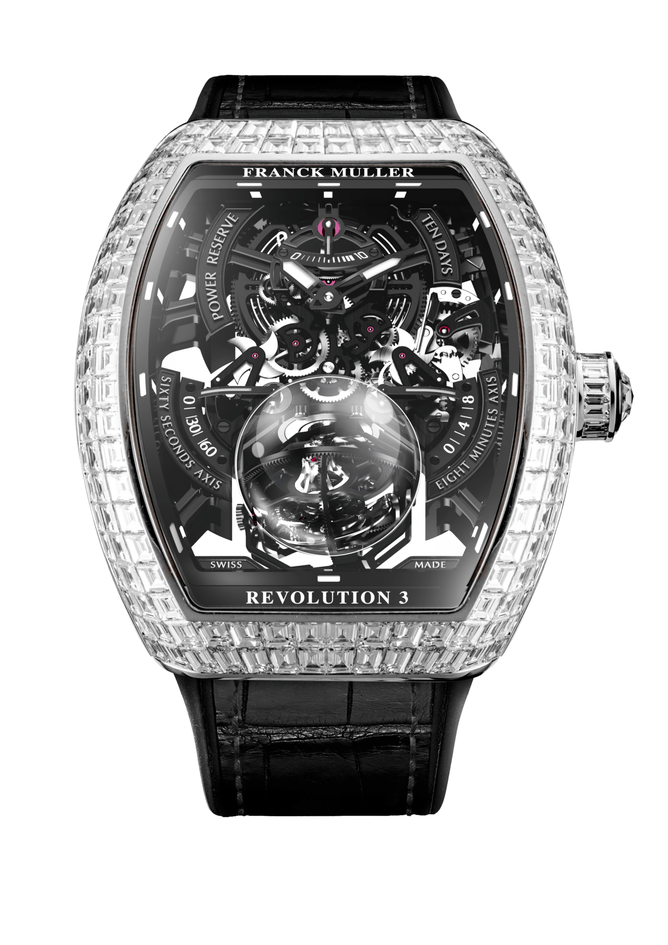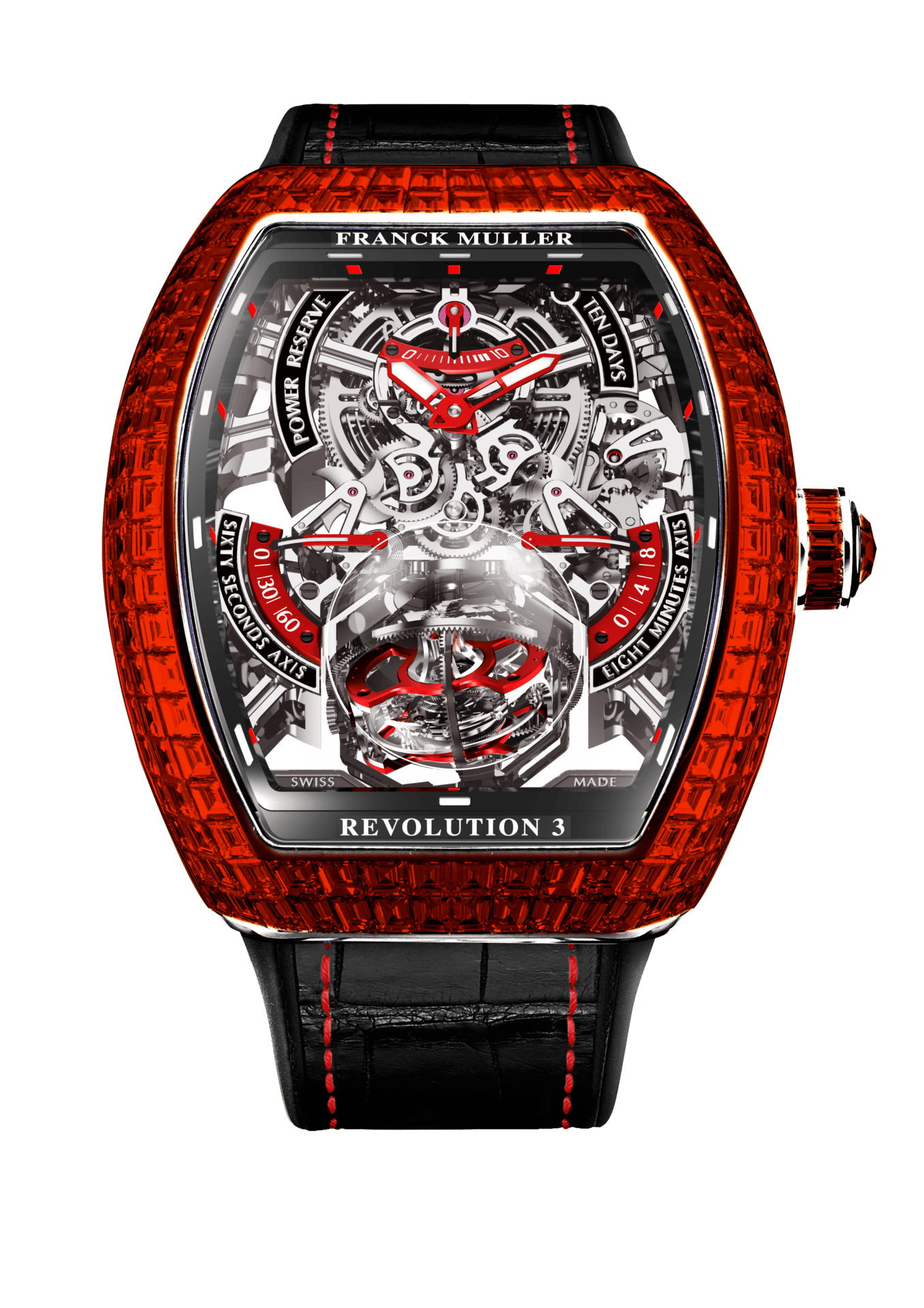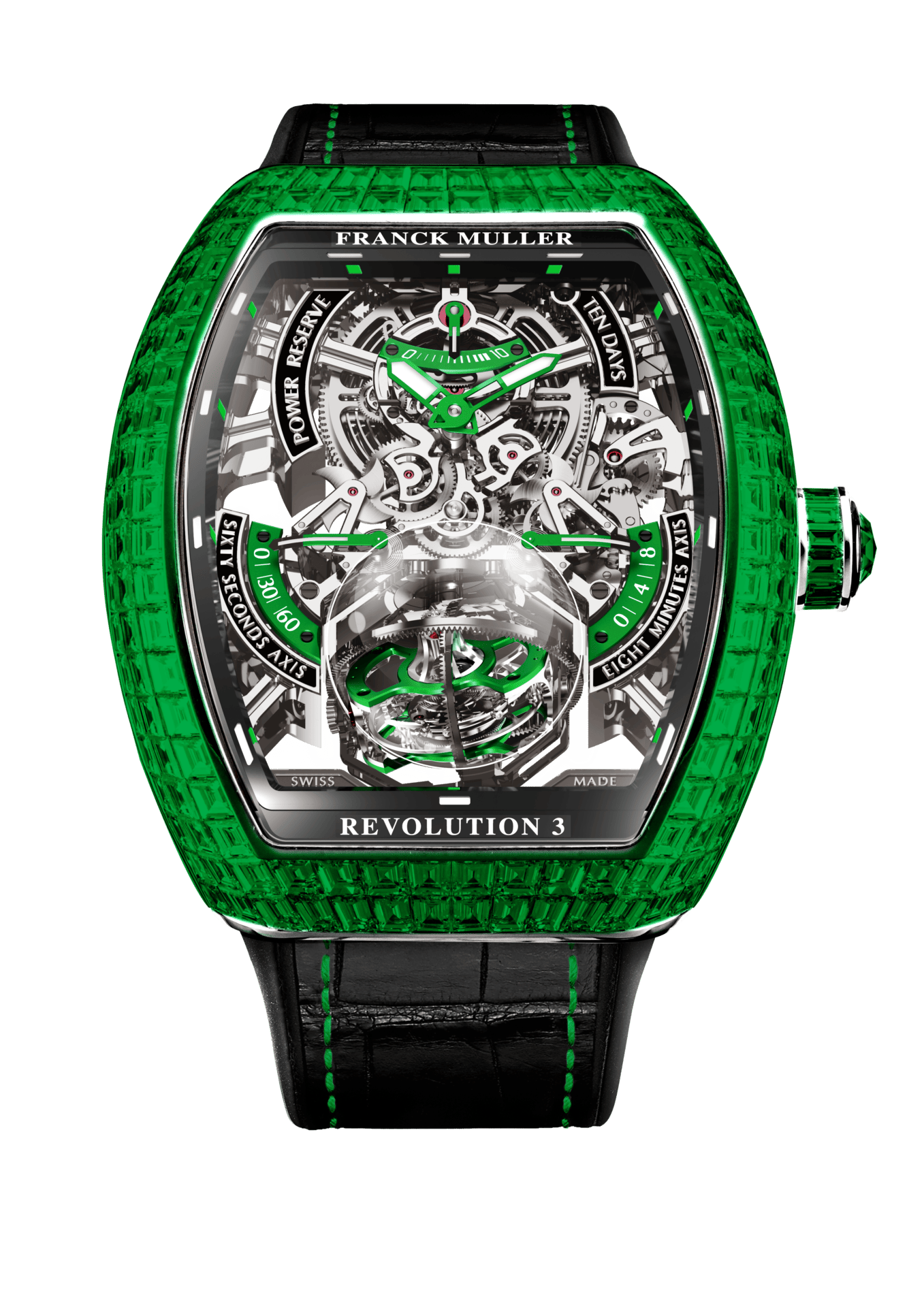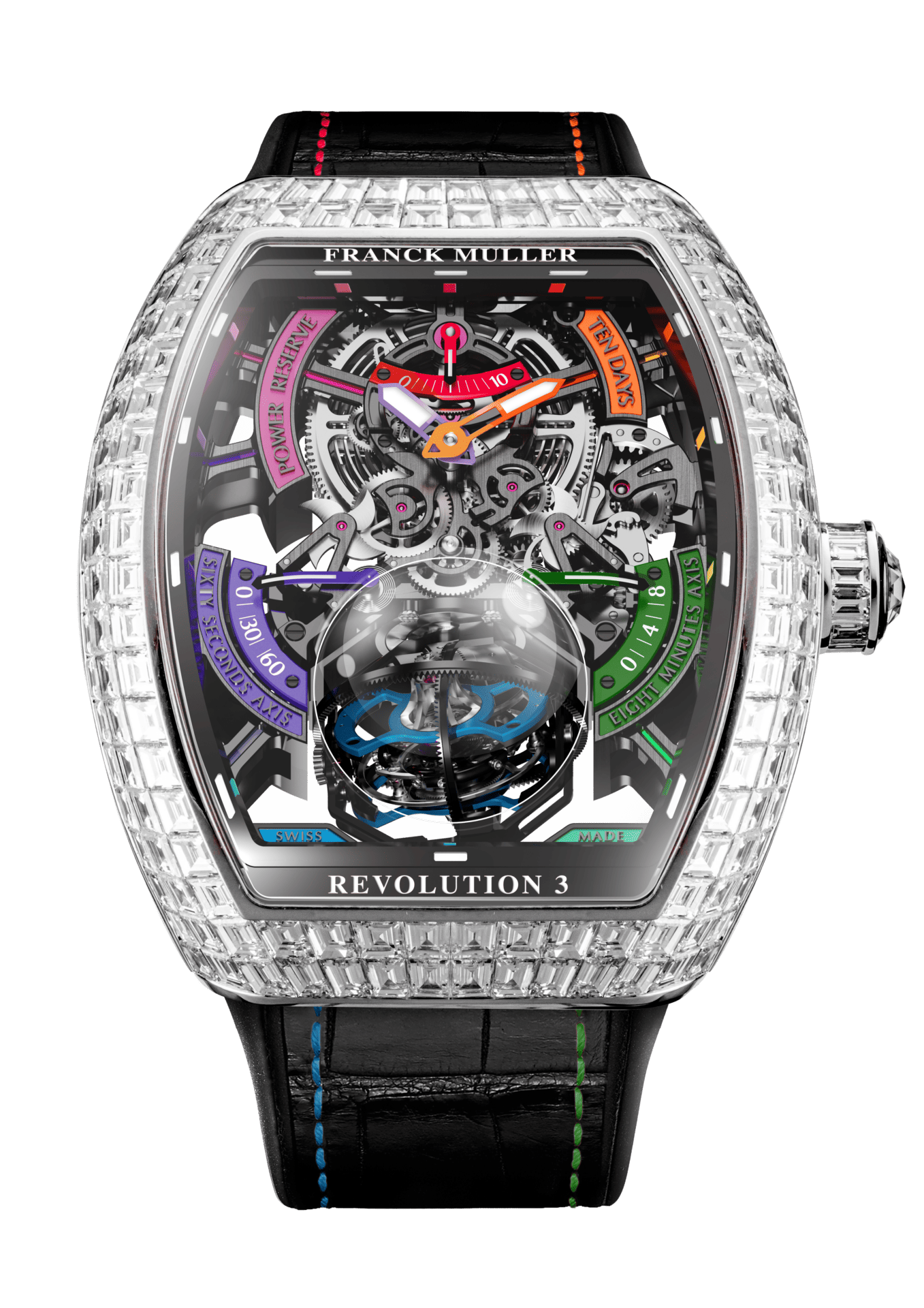 除了精湛的技术,纪念版Revolution 3 Skeleton的外形也非常出色。结合了当代和新古典艺术风格的设计风格,透过拱形的蓝宝石水晶镜面来放大并彰显三轴陀飞轮与镂空机芯的绝美风采。法穆兰匠师甚至还为 5 只设计截然不同的纪念版Revolution 3 Skeleton 镶上了长形白钻、红宝石和祖母绿,再配以彩虹色调或酷黑表盘,每个版本都叫人惊艳。