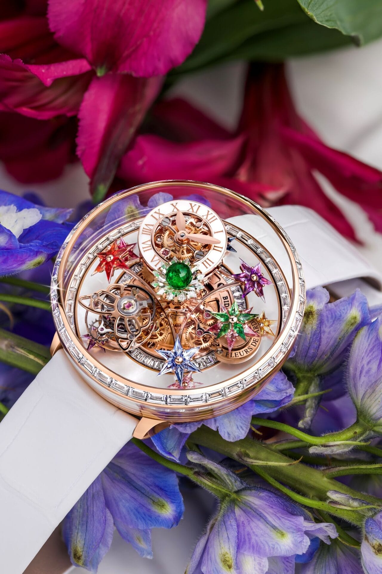 表盘上层的花朵随着卫星臂顺时针或逆时针旋转,而下层的珍珠母贝表盘上,则有更多的花朵逆时针旋转,确保了无论何时看表,其图案都独一无二。腕表镶嵌了大量钻石和各色珍贵宝石,如沙弗莱石、红宝石和蓝宝石等。腕表搭载手动上链机械机芯,动力储存达48小时。其镂空设计不仅减轻了重量,也让佩戴者能够一览机芯的精密运转。腕表犹如一件融合了顶级制表技术与高级珠宝工艺的艺术品,将一个充满生机与色彩的微缩花园,永久凝固于腕间。