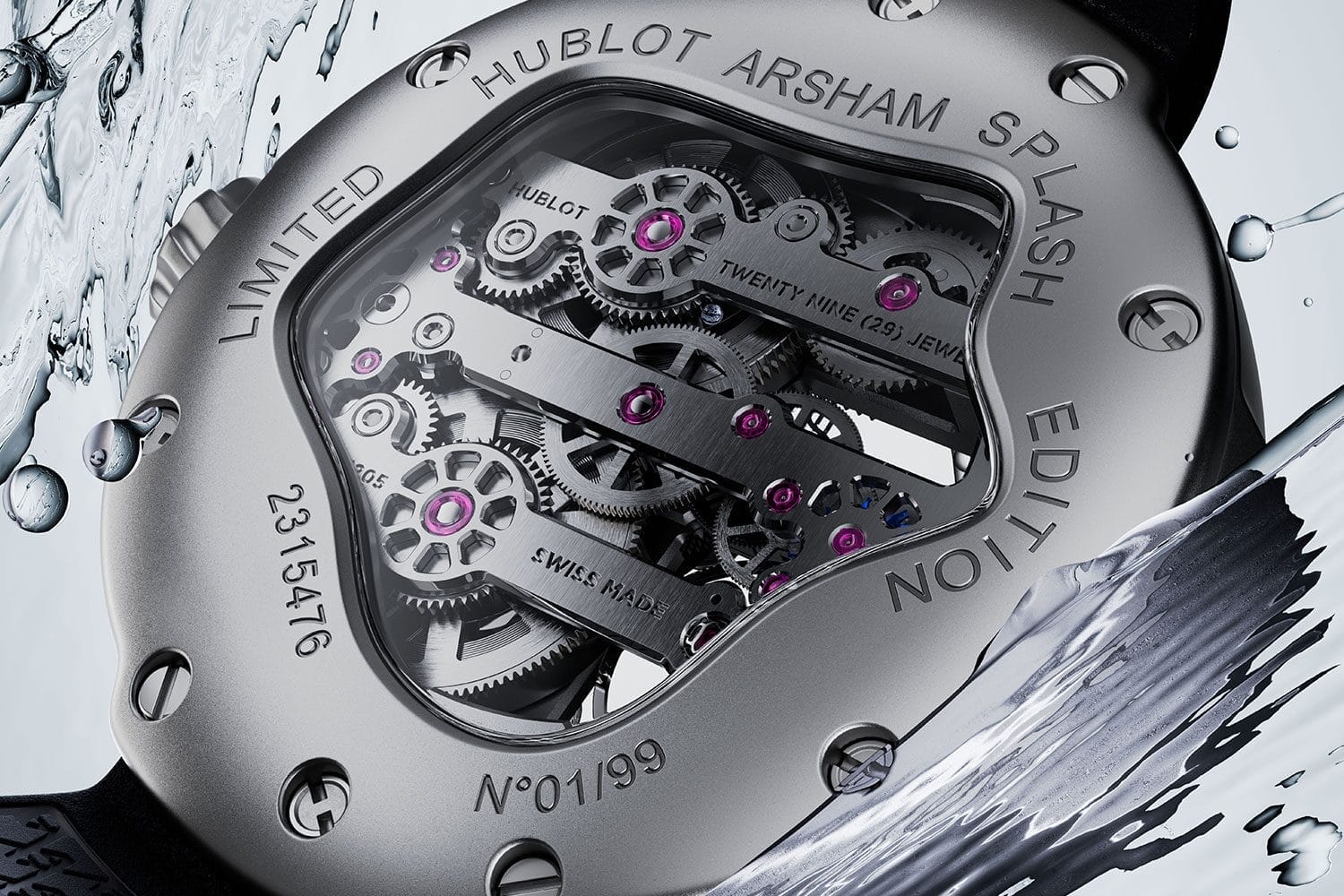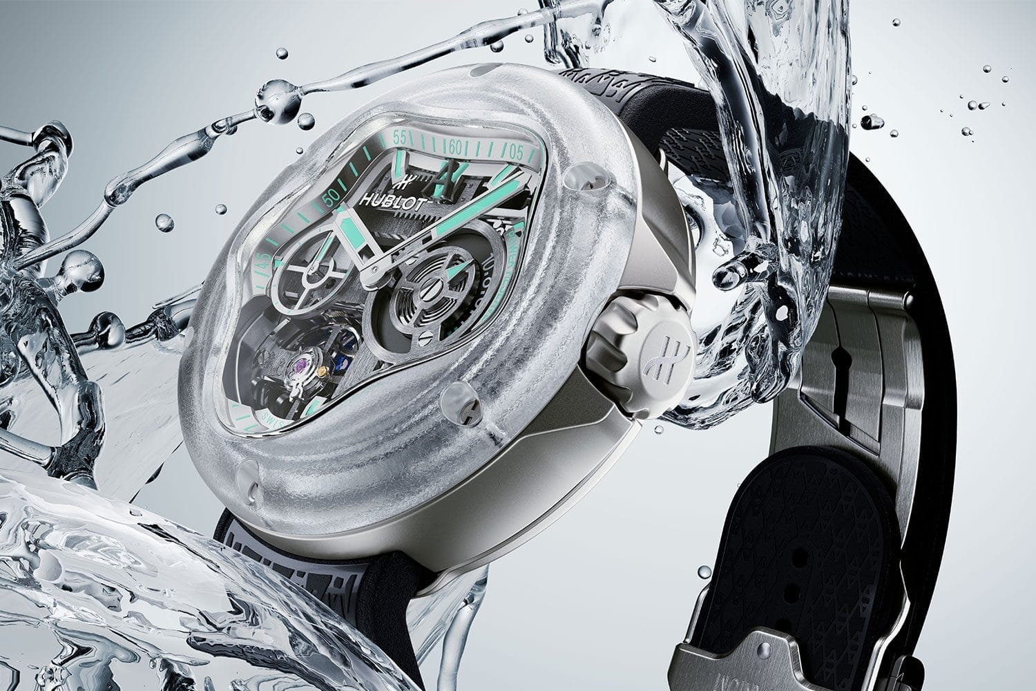Arsham 补充道:“这款联名款通过一个灵感源自水滴完美几何形状的表壳,并采用 Hublot Meca-10 机芯,探索了时间的流动性。腕表透明的结构捕捉了水的清澈与动态——悬浮、精确、且永远在变化。”