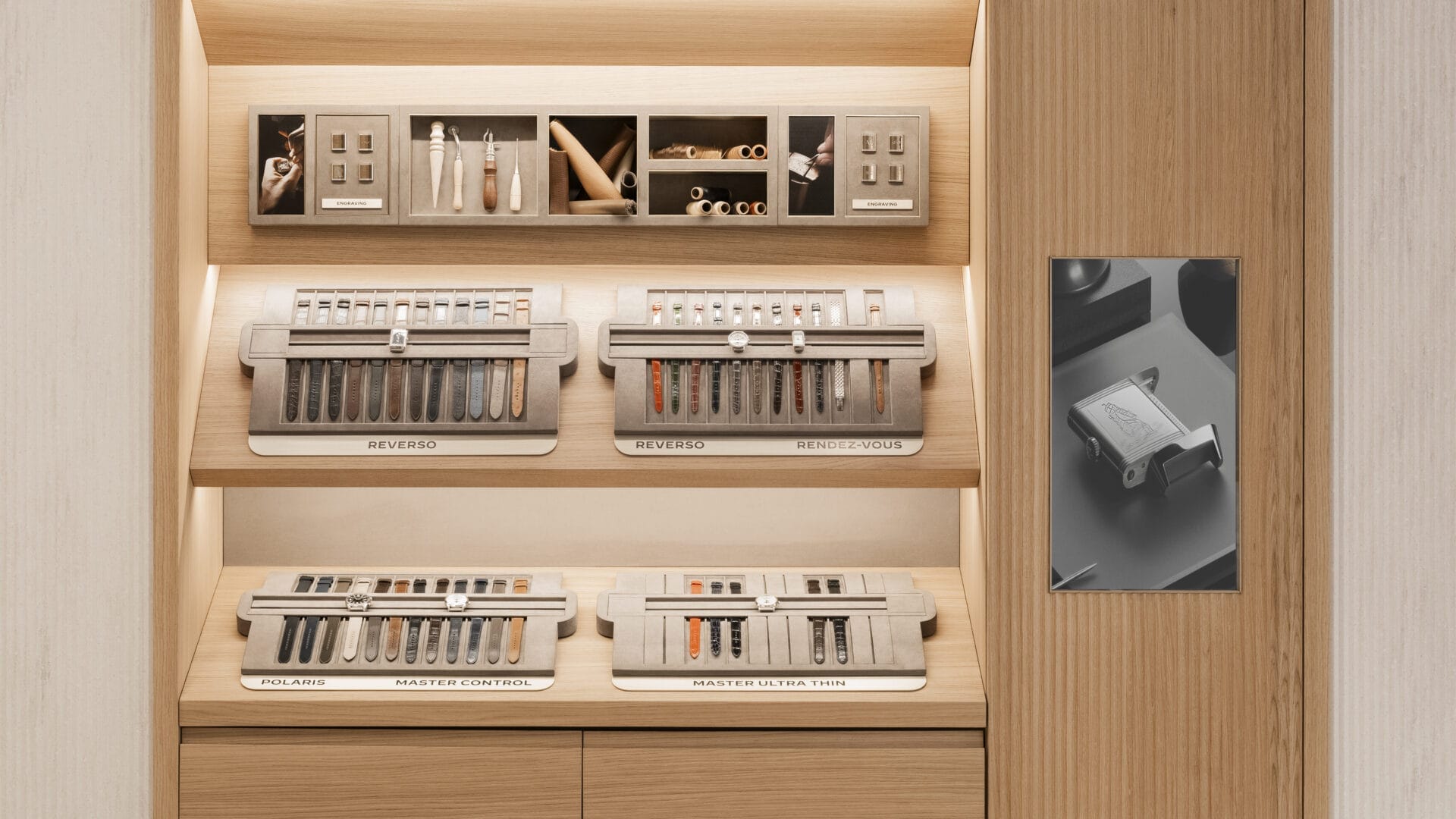 新旗舰店与前精品店位于同一地址,入口位于两个大厨窗之间,营造出开阔与温馨的氛围。双层挑高的内部空间采用自然色调和有机材质,如石灰岩、橡木和黑色磨砂金属装饰等细节,让人联想起积家在汝拉山谷(Vallée de Joux)的大工坊。