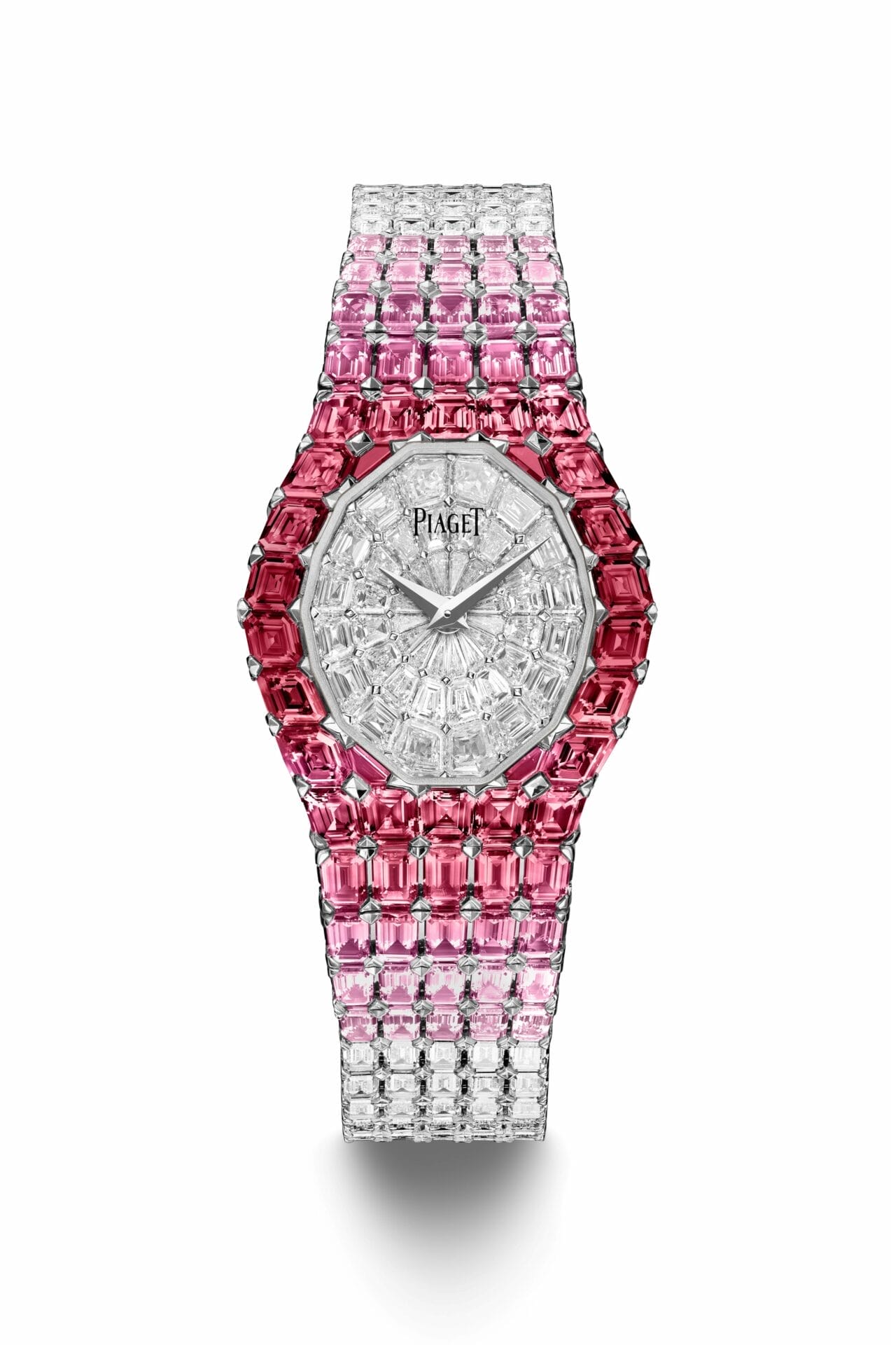 Aura高级珠宝腕表无缝接合的表链与表壳全面铺镶着长方形切割钻石,完美体现伯爵在宝石镶嵌上的非凡实力。