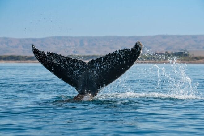 澳大利亚埃克斯茅斯湾的座头鲸尾巴。座头鲸的寿命可达 80 至 90 年,是所有哺乳动物中迁徙距离最长的动物之一。