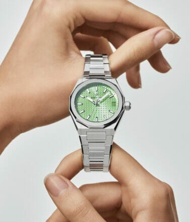 真力时(Zenith)全新 Defy Skyline 腕表迎来表壳直径 36 毫米款式,沿袭原型腕表棱角分明的造型,其八边形精钢表壳,带有镶钻刻面表圈,搭配粉绿色太阳纹金属表盘,重新演绎品牌富有代表性的四芒星标志。腕表搭载真力时原厂自产的 Elite 670 型自动上链机芯,同时设有表带快速更换机制,可轻松更换精钢表链和随附的绿色橡胶表带。