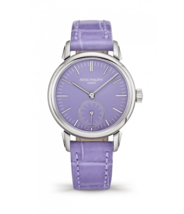 百达翡丽(Patek Philippe) Calatrava Ref. 7127G-010 限量版腕表秉承 “对表” 传统,采用全新 Calatrava 表壳,搭配双层槽纹倒角表耳,巴顿式立体时标和 “Cheveu” 式指针采用白金材质,为表盘增添简约优美的细节。腕表表壳直径 31 毫米,采用淡紫色表盘及表带,搭载最小巧的机械机芯 —— 215 PS 手动上弦机芯。腕表限量发行 400 枚。