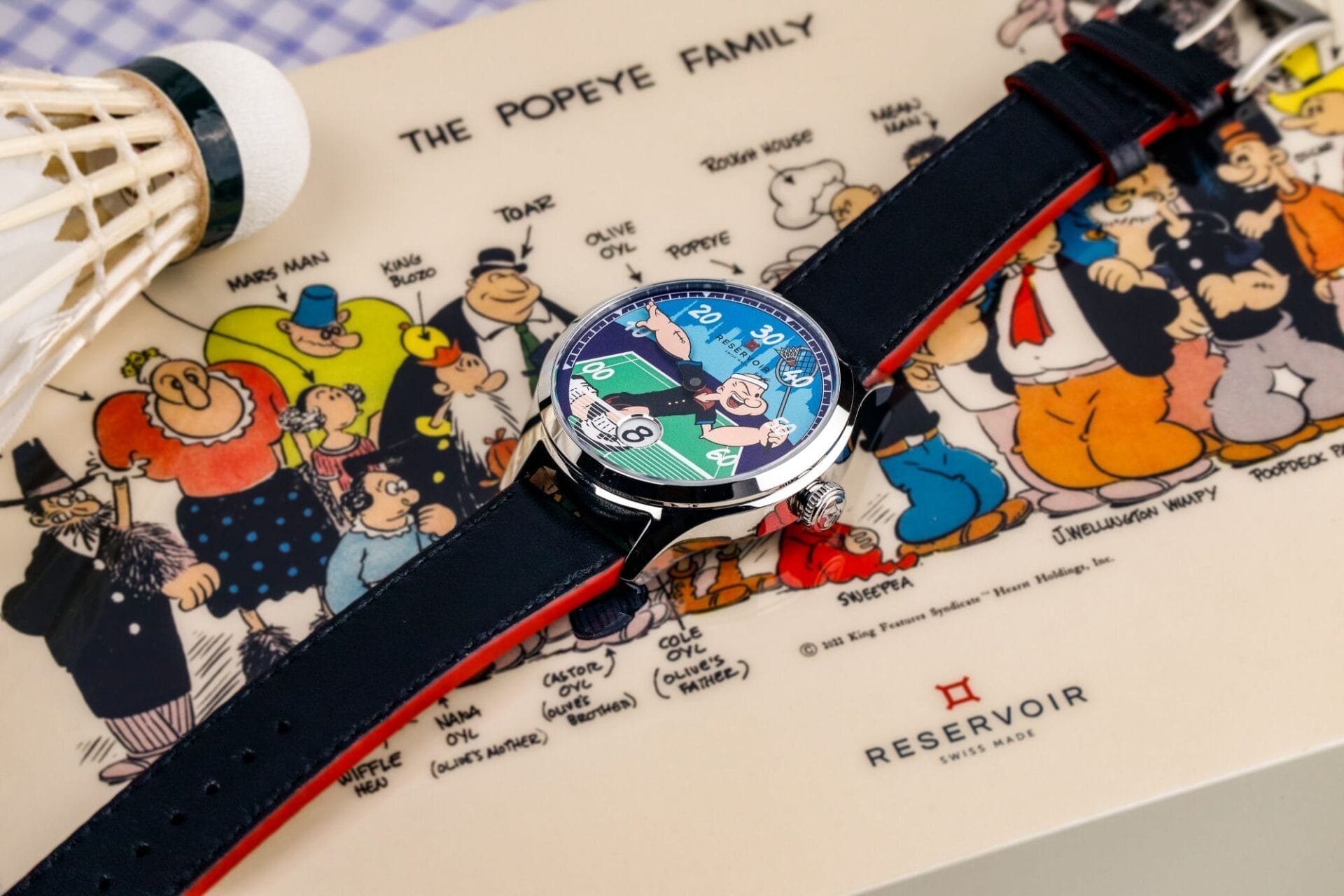 这款时计是为了致敬深受马来西亚人喜爱的羽毛球运动而精心设计。其独特的跳时和逆跳分钟功能,巧妙地呼应了羽毛球比赛中那种充满活力、精准计算的节奏。表盘图案则生动呈现了经典角色大力水手 Popeye 在羽毛球场上准备击球的画面,极具玩味与纪念价值。