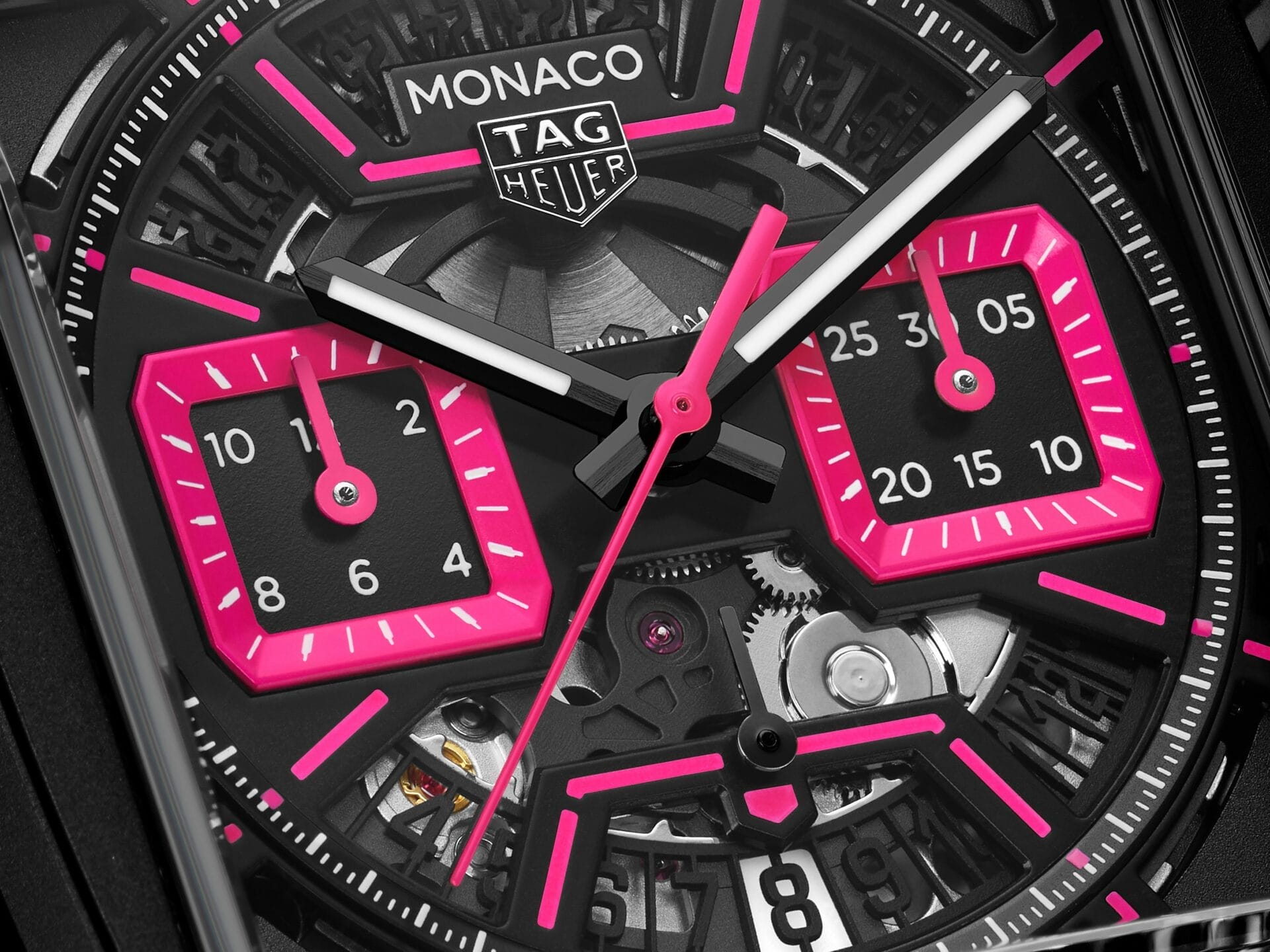 全新粉红色 TAG Heuer Monaco Chronograph计 时码表,将俏皮活力与现代美学巧妙融合,同时传承了这个系列的深厚传统。腕表犹如一部随时间滴答展开的故事,以鲜艳的粉红色镂空表盘致敬色彩之美,灵感来自于拉斯维加斯的热闹氛围与标志性霓虹灯光。其大胆设计专为那些以风格彰显自信与个性的人而打造。