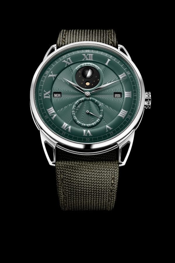 De Bethune在此次的迪拜钟表周带来一款绿色版本的DB25 Perpetual Calendar万年历腕表。这是一款结合制表的精湛技艺与制表厂的尖端机械技术的腕表,延续经典DB25表款的12个扇形放射状扭索饰纹、一体式表耳及全新钛金属表壳。这款DB25 Perpetual Calendar万年历腕表充满诗意,将月相、星空及万年历融入在表款中,直径44毫米的圆形表壳由钛金属制成,12点钟位置有一个由钯金和黑色氧化锆制成的球体坐落在镶有金色星星的天空中,还在其金色圆点中加入了闰年指示器,6点钟位置设有日期显示盘,而星期和月份的显示窗则分别位于9点钟及3点钟位置,搭配绿色纺织表带,配有抛光钛金属表扣和别针,还附加一条皮革表带。