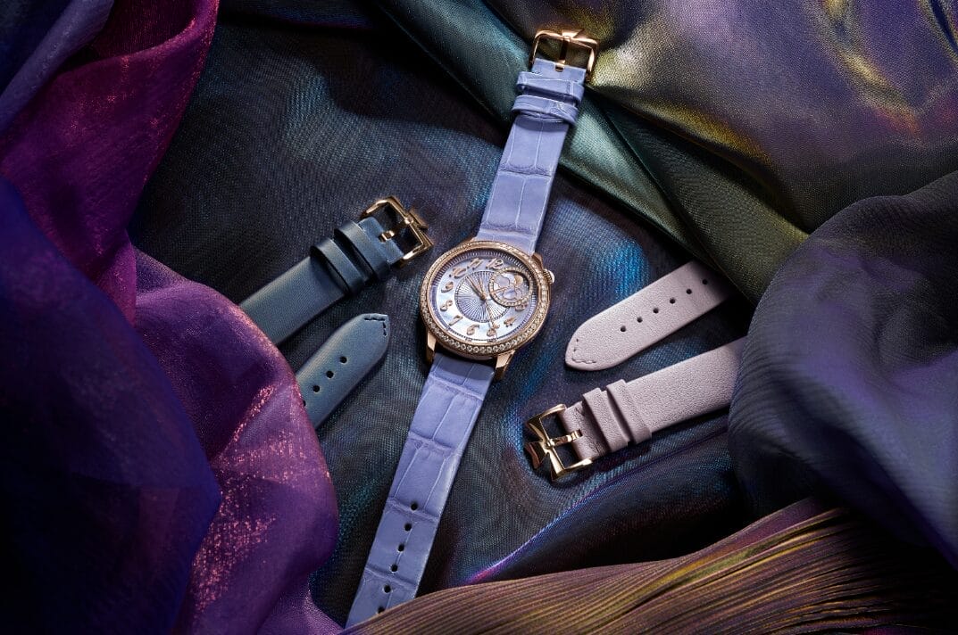 双方合作的新品包括一款“The Pleats of Time – 时之褶”概念腕表和一款限量仅 100 枚的月相表。概念腕表表径 37 毫米,粉红金镶钻表壳搭配饰有褶皱纹饰的丁香紫色珍珠贝母表盘;表带则饰以刺绣质感的编织纹理,镶嵌细密的珍珠贝母碎片,展示优雅女性气韵。特别的是,品牌还特别邀请法国调香大师 Dominique Ropion 调制出一款独创的专属香氛,他必须将香氛精华浓缩为微小的液滴,包裹于纳米胶囊内,再渗透至表带的各个部件,随着腕间的动作就会释放出香气。