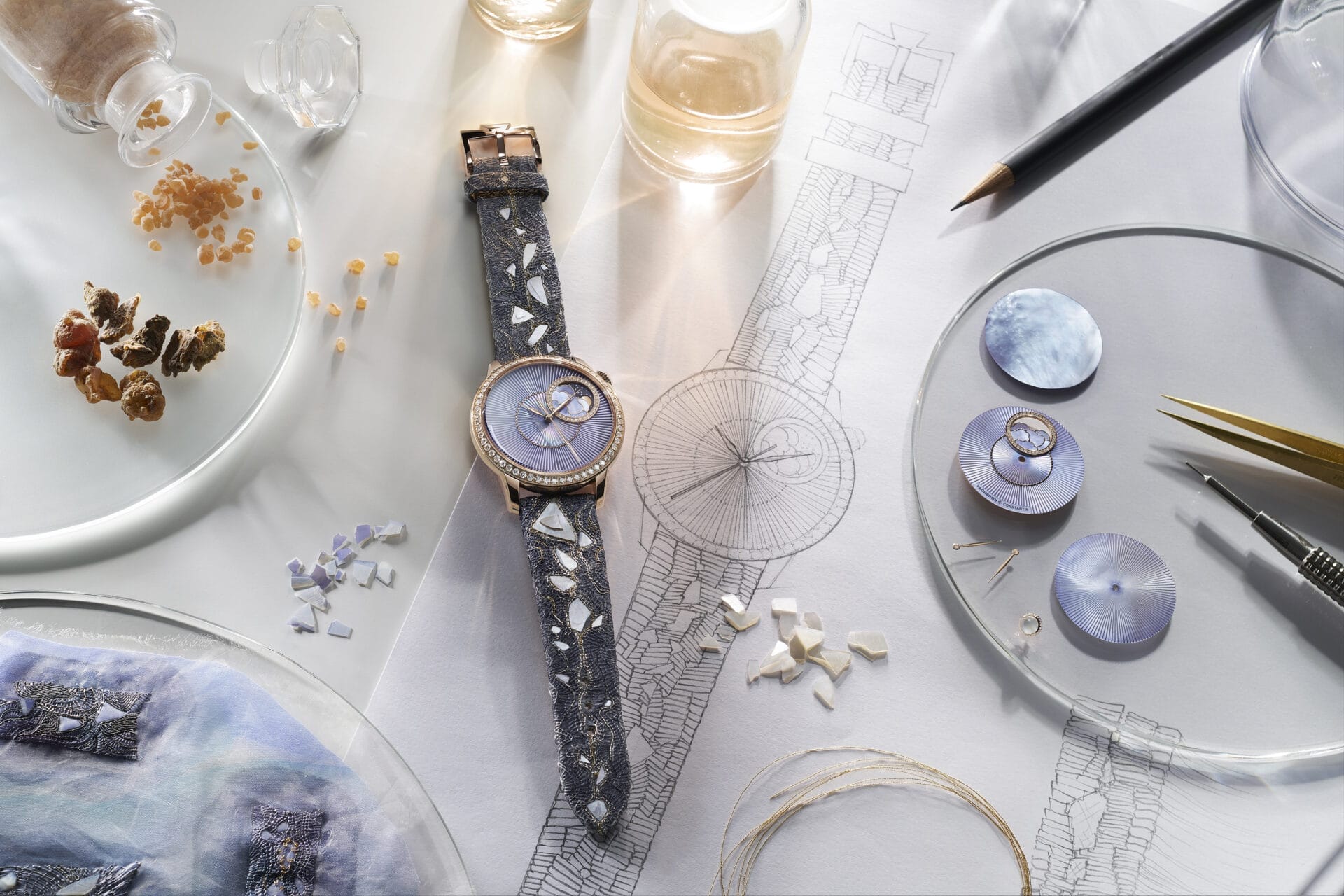 双方合作的新品包括一款“The Pleats of Time – 时之褶”概念腕表和一款限量仅 100 枚的月相表。概念腕表表径 37 毫米,粉红金镶钻表壳搭配饰有褶皱纹饰的丁香紫色珍珠贝母表盘;表带则饰以刺绣质感的编织纹理,镶嵌细密的珍珠贝母碎片,展示优雅女性气韵。特别的是,品牌还特别邀请法国调香大师 Dominique Ropion 调制出一款独创的专属香氛,他必须将香氛精华浓缩为微小的液滴,包裹于纳米胶囊内,再渗透至表带的各个部件,随着腕间的动作就会释放出香气。