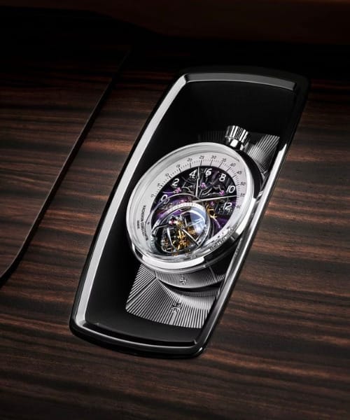 为方便收纳从仪表台取下的时计及支架,江诗丹顿还特别打造了一个专属展示盒,采用与车身内饰相同的木材和紫水晶色皮革材质。时计搭载1990品牌自制机芯,具备小时和分钟瞬时双逆跳显示,令人联想到经典的车速表。机芯中的双轴浑天仪式陀飞轮不断上演着曼妙的机械旋舞,其构造源自18世纪采用浑天仪式装置的天文钟。秉承江诗丹顿的精湛传统,时计及支架均按照客户的个性化需求,经过精细的装饰打磨。这是江诗丹顿为汽车领域创制的首款当代时计作品。