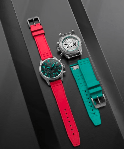 这款计时腕表是IWC万国表为合作伙伴打造的首款官方车队用表,并致敬了车队设计师、空气动力学家、赛车工程师、战略师和机械师的昂扬向上的热情与执着坚毅的精神。活力粉表带与迈阿密国际赛道 (Miami International Autodrome) 相得益彰,刘易斯·汉密尔顿 (Lewis Hamilton) 和乔治·罗素 (George Russell) 的手套、鞋子上同样点缀以闪耀夺目的粉色。