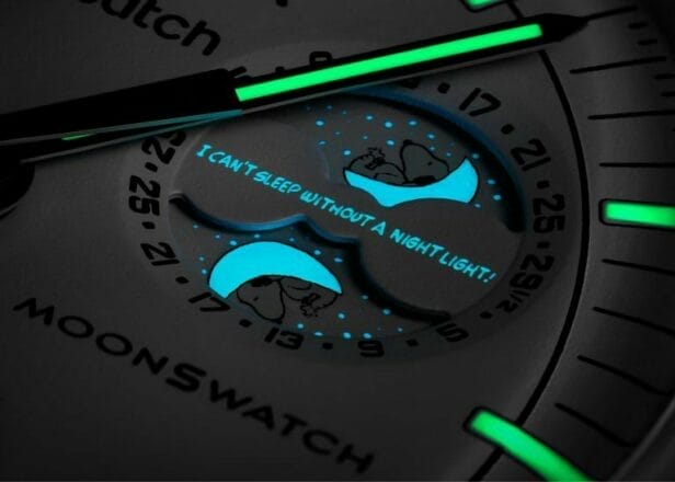 这款腕表具备所有腕表复杂功能中最具有诗意的月相功能,更显独特。月相盘上饰有 1960年代以来担任 NASA 吉祥物的 Snoopy 睡在月亮上的可爱形象,在2点钟位置的小表盘上移动。在紫外光照射下,腕表独特的小表盘上还会显示出隐藏在弯月和星星中的 Snoopy 漫画经典台词。每个款式的表盘上都有 OMEGA X Swatch 的标志,以及代表性的 Speedmaster 和 MoonSwatch 标志。
