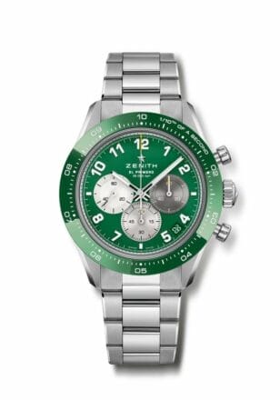 其表盘亦采用与表圈同一色调的绿色漆面表盘与之呼应,并首次在 CHRONOMASTER Sport 腕表系列中,采用形似球衣号码的镶贴夜光阿拉伯数字时标。该款腕表的三 色表盘以岩灰色、浅灰色和银色的配色组合重新演绎。其三节精钢表链搭配精密调节表扣,令此腕表的 整体运动设计臻于完善,同时兼备佩戴舒适感。腕表搭载最新一代 El Primero 机芯,振频高达5赫兹(36,000 次/小时),可精确显示 1/10 秒,把握每一个可能决定成败的关键瞬间。
