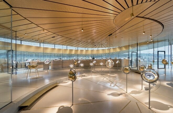 这座设计大胆破格的螺旋式建筑,由丹麦BIG建筑公司打造,灵感来自爱彼钟表的表盘,整个建筑仿佛深嵌于地景中,弧面玻璃帷幕外立面营造通透的视觉感,将绝美的绿景山色融入建筑内部。