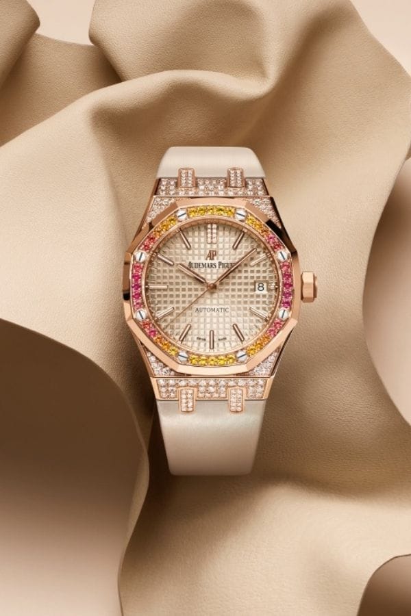 爱彼(Audemars Piguet)The Royal Oak腕表系列以全新色彩和宝石亮相,两款37毫米腕表以18K白金和玫瑰金打造,表圈镶嵌40颗明亮式切割宝石,每一颗宝石精心挑选,经过单独切割和抛光,再以手工镶嵌在表圈,根据不同表款而呈现出从红色、橙色到粉红色的渐变色调,让宝石折射出璀璨光芒。
