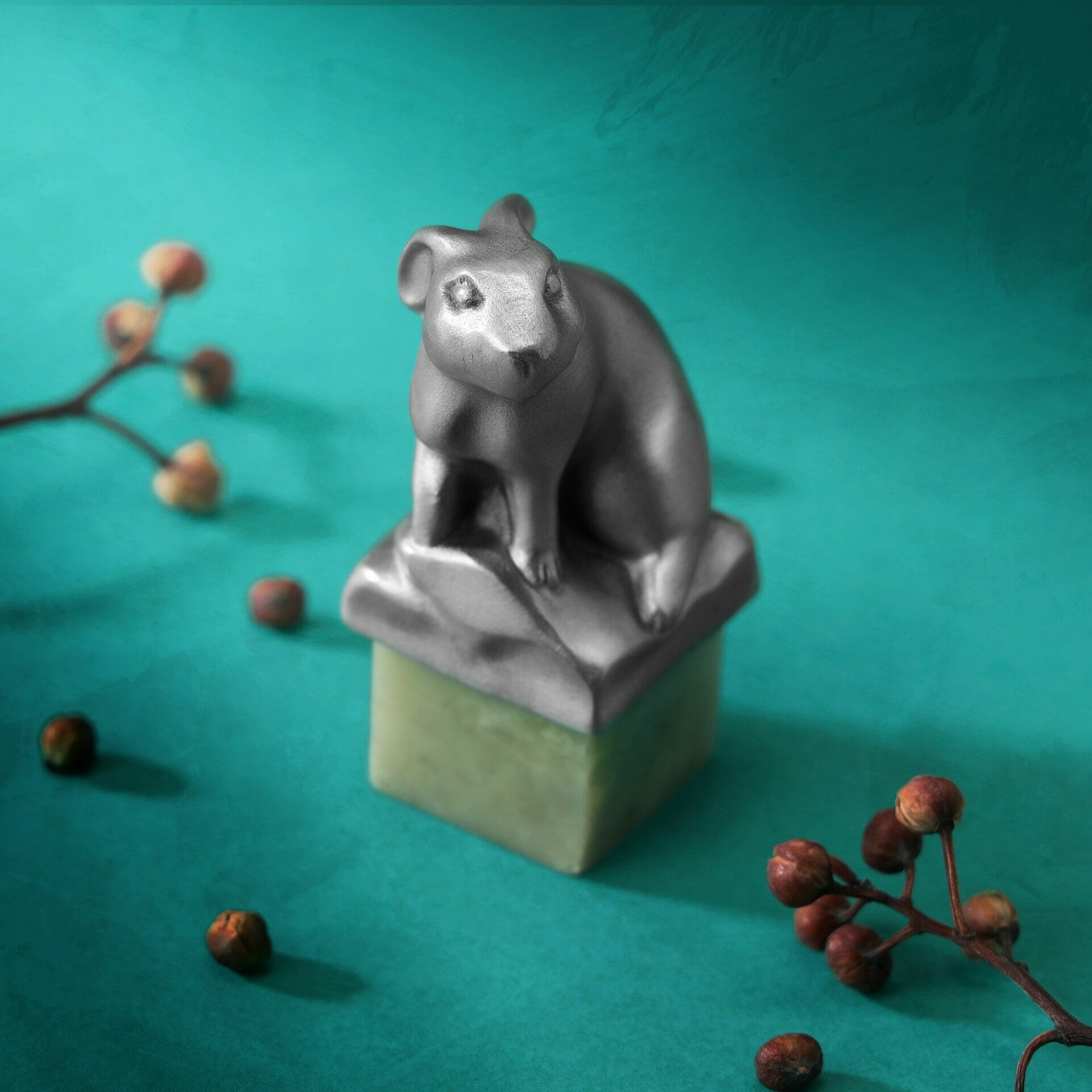 以滑石作为印章底座,上方的兔子雕像神情惟妙惟肖,仿佛正好奇探索世界,非常可爱。
