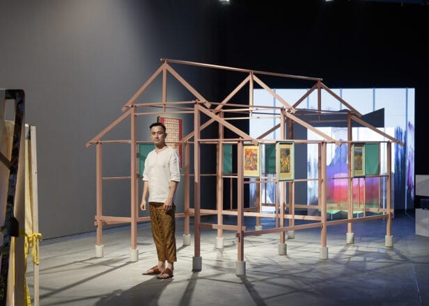 展览入口最先映入眼帘的,是《高脚屋——甘榜峇鲁的浮世》。这座仿造马来高脚屋骨架结构的装置作品,承载着七幅细密画。装置结构采用传统“tanggam”榫卯工艺,呼应吉隆坡甘榜峇鲁(Kampung Baru)曾随处可见的木构民居,也象征着维系社区的“互助精神”(gotong-royong)。画作悬挂于木构之间,串联起这个拥有约 120 年历史的村落记忆。