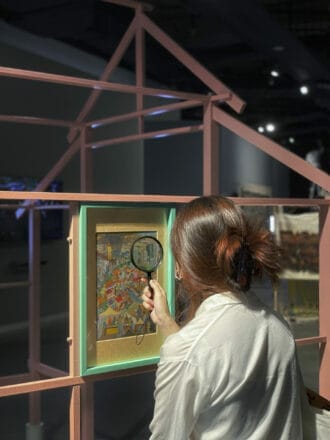 其中一幅作品被安置于装置结构中央,观者需走入这座木构屋内,才能看清整幅画面。展场也特别准备了放大镜,邀请观众细读画中密密麻麻的细节与人物。艺术家希望借由这样的设置,引导观者真正走进画中所触及的议题,在观看之余,更深入理解那些与地方、历史和记忆交织的复杂关系。